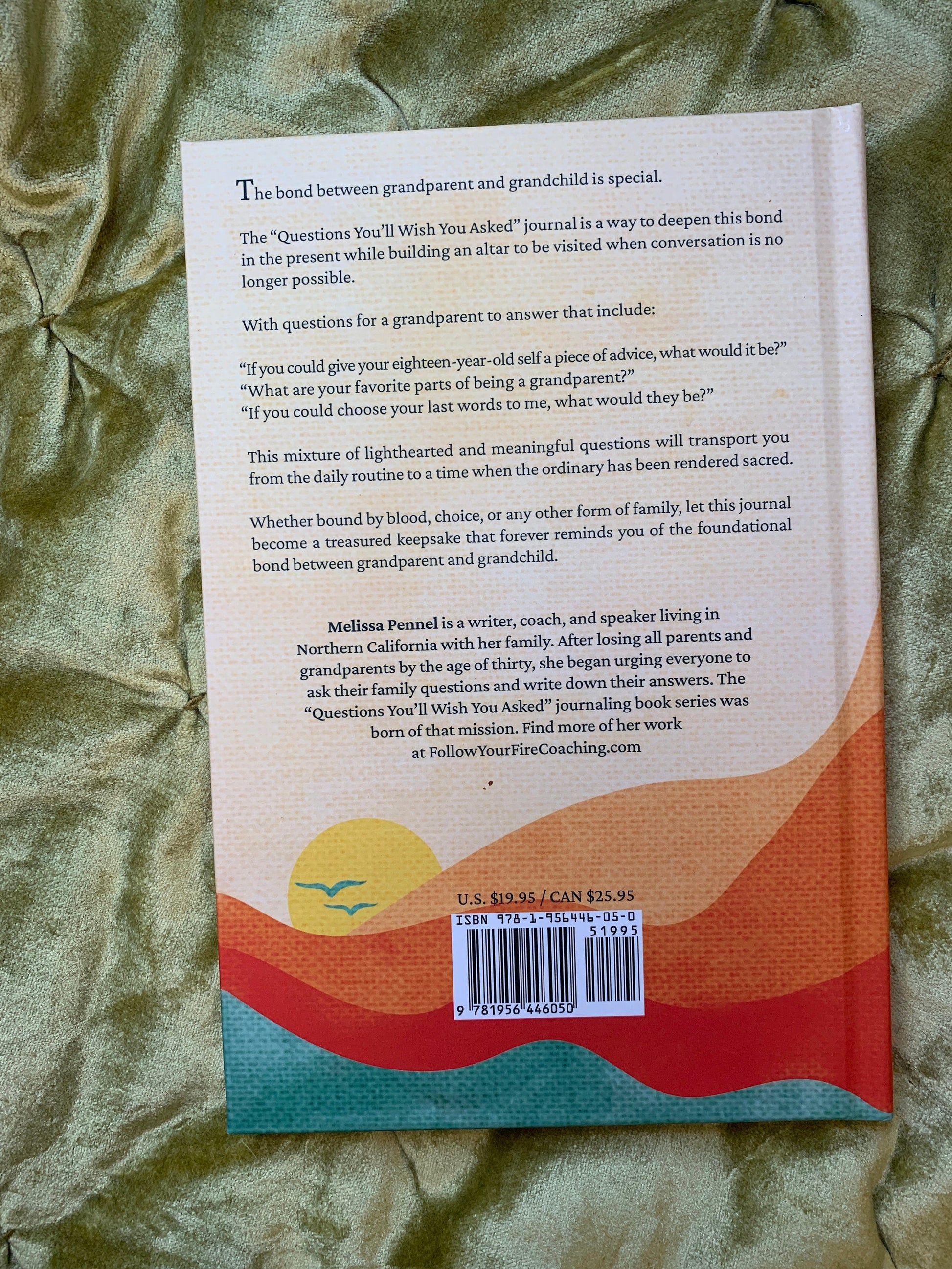 Some adult grandchildren sit with their grandparents and fill out the journal while asking the questions: this invites thoughtful conversations, generational connection, and intimacy. Others choose to purchase the journal for themselves, fill it out, and later present it as a gift to their grandchildren. This journal can be an especially thoughtful gift for a grandparent who has lost their spouse; these individuals often deeply recognize the importance of recording thoughts and memories for their grandchildren. This journal is also a thoughtful gift for adult children whose parents may be struggling with early signs of memory loss, dementia, or Alzheimer’s; asking these questions can jog a parent’s memory, inspire thoughtful conversation, or simply provide a space to appreciate the grandparent who still remains.
