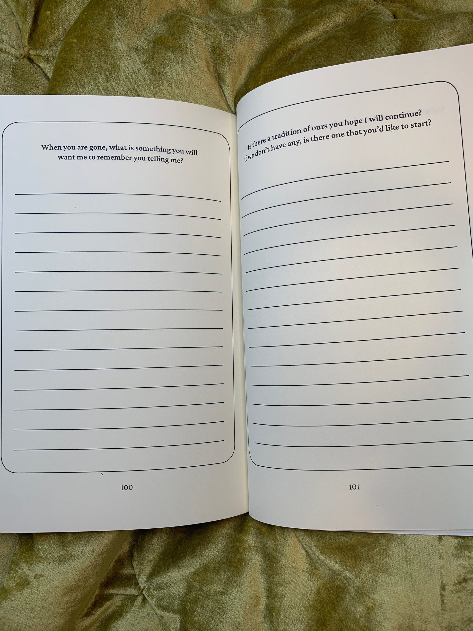 Some adult children sit with their parents and fill out the journal while asking the questions: this invites thoughtful conversations, generational connection, and intimacy. Others choose to purchase the journal for themselves, fill it out, and later present it as a gift to their children. This journal can be an especially thoughtful gift for a parent who has lost their own mother or father; these individuals often deeply recognize the importance of recording thoughts and memories for their children. This journal is also a thoughtful gift for adult children whose parents may be struggling with early signs of memory loss, dementia, or Alzheimer’s; asking these questions can jog a parent’s memory, inspire thoughtful conversation, or simply provide a space to appreciate the parent who still remains.