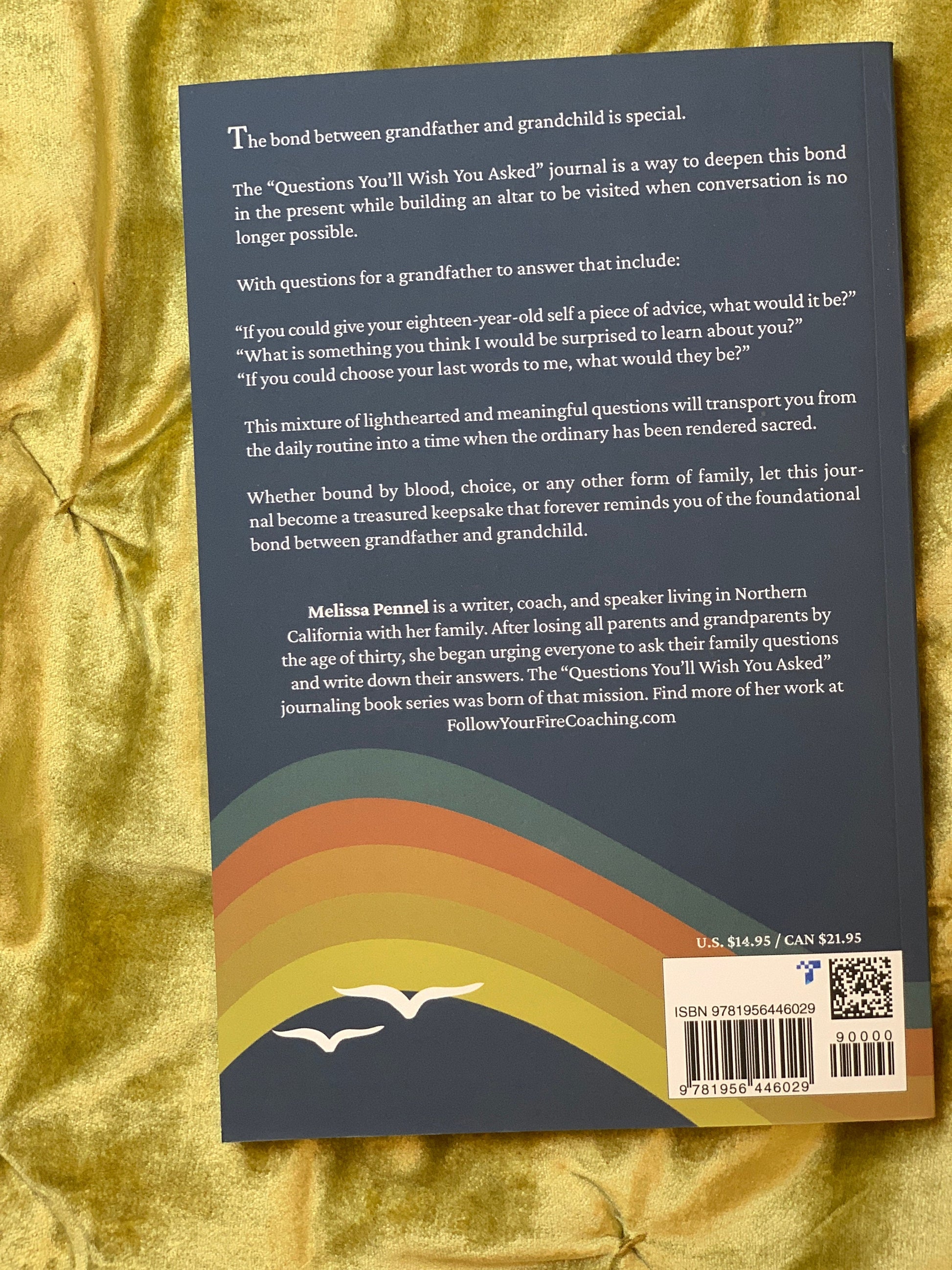 Some older grandchildren sit with their grandparents and fill out the journal while asking the questions: this invites thoughtful conversations, generational connection, and intimacy. Others choose to purchase the journal for themselves, fill it out, and later present it as a gift to their grandchildren. This journal can be an especially thoughtful gift for a grandfather who has lost his spouse; these individuals often deeply recognize the importance of recording thoughts and memories for their grandchildren. This journal is also a thoughtful gift for adult children whose father may be struggling with early signs of memory loss, dementia, or Alzheimer’s; asking these questions can jog a parent’s memory, inspire thoughtful conversation, or simply provide a space to appreciate the grandfather who still remains.